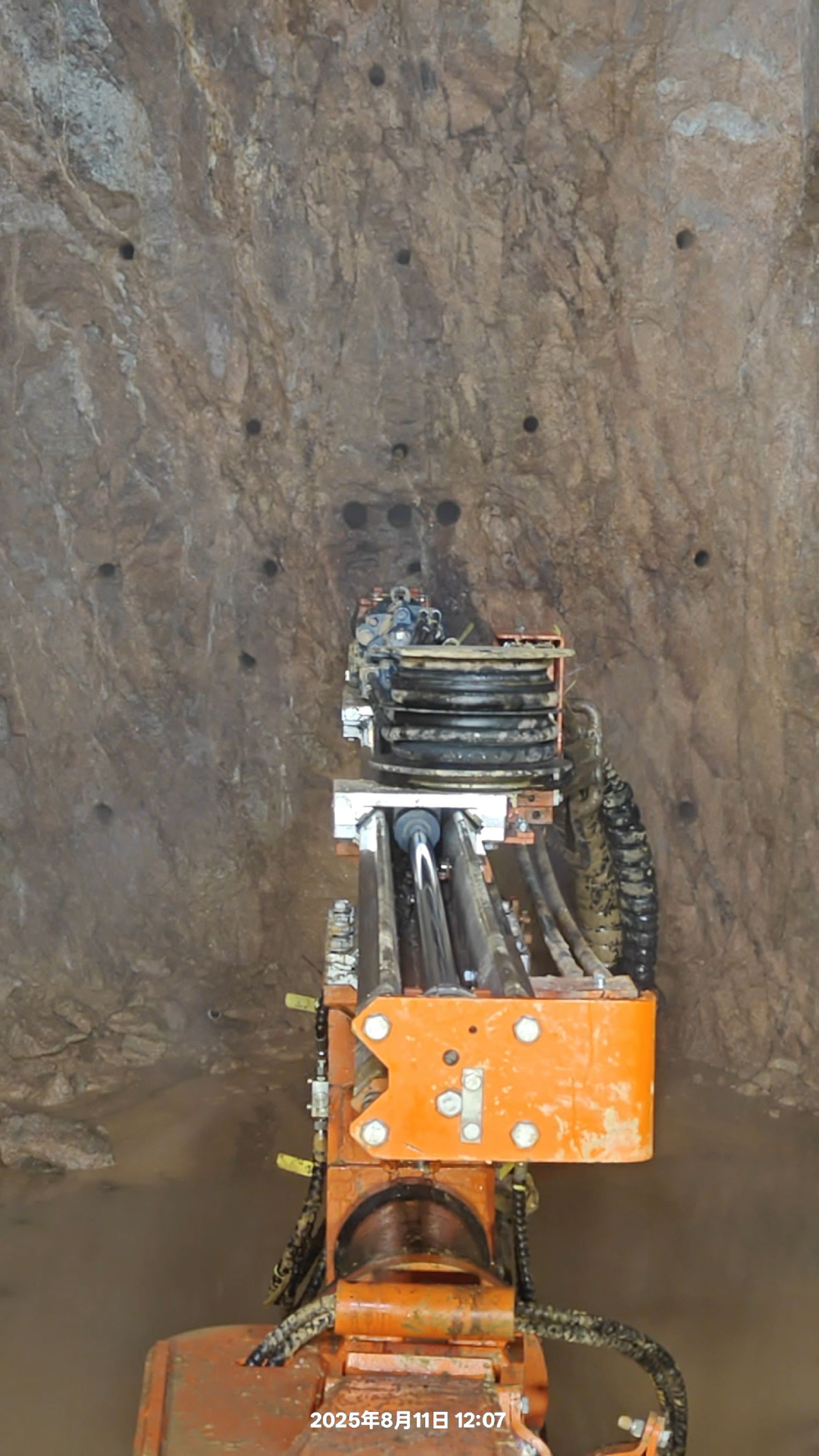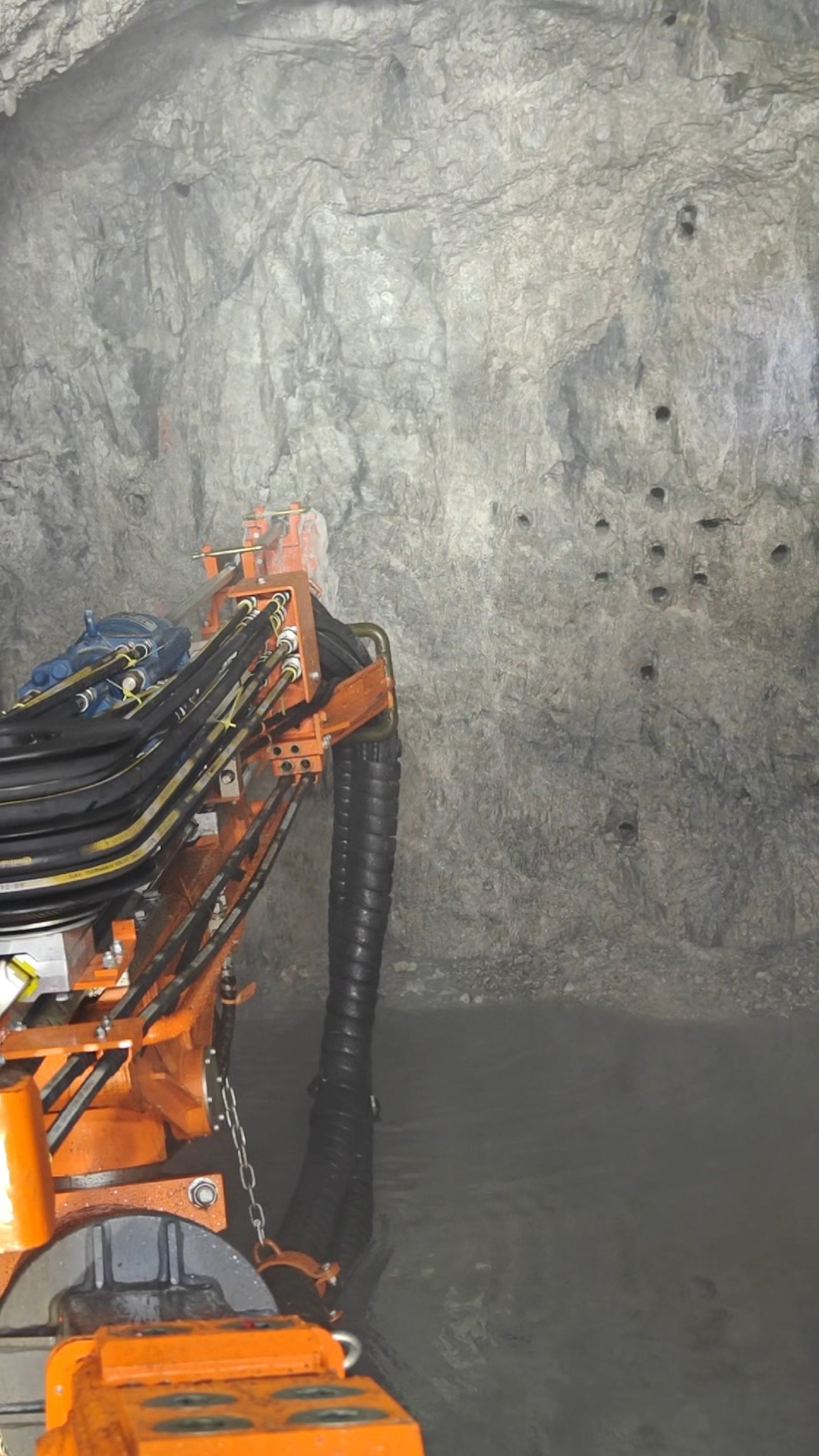 内蒙古 萤石矿,断面3*3米,#掘进台车配套沃思德18kw液压凿岩机,孔深3.4米,单孔平均用时1分钟30秒。#沃思德凿岩机#凿岩钻车#工程机械