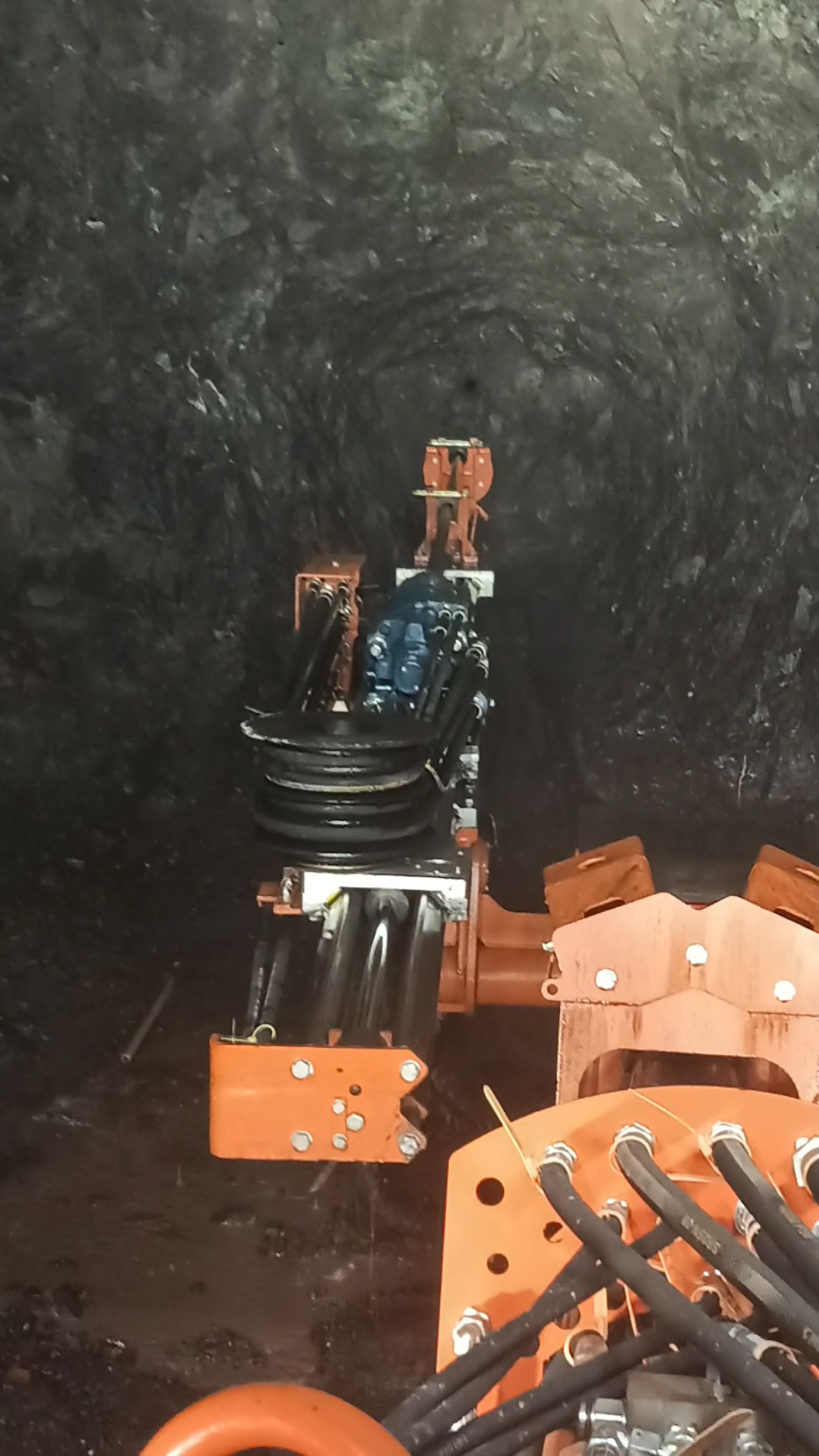 内蒙古 萤石矿,断面3*3米,#掘进台车配套沃思德18kw液压凿岩机,孔深3.4米,单孔平均用时1分钟30秒。#沃思德凿岩机#凿岩钻车#工程机械